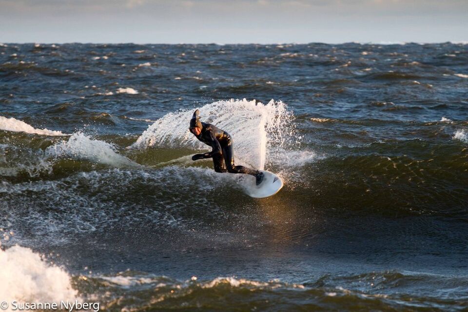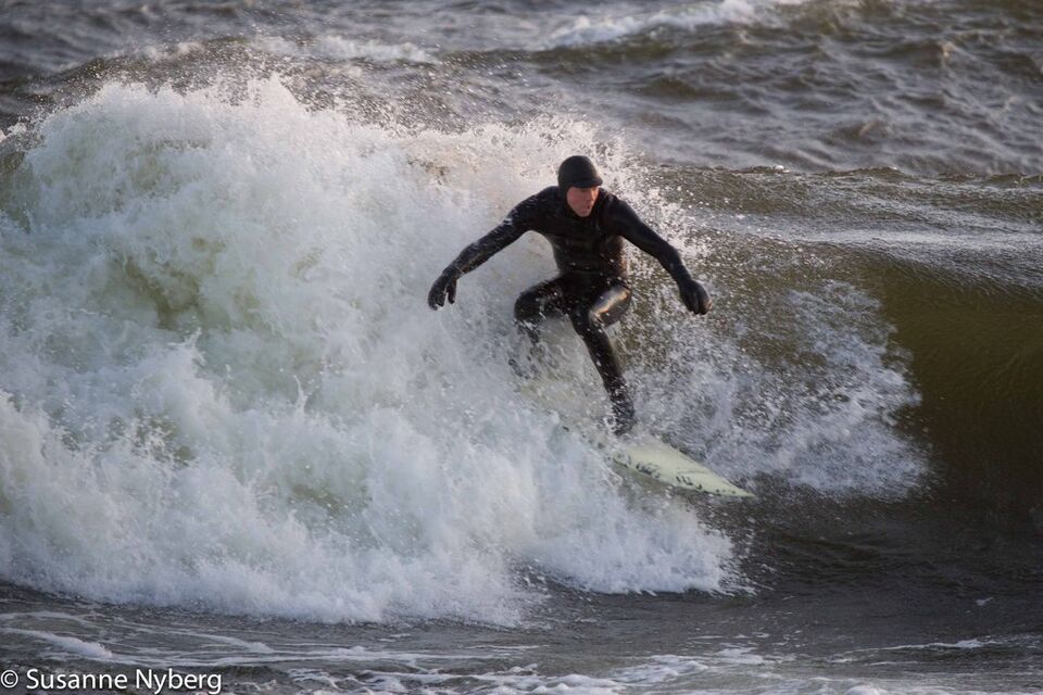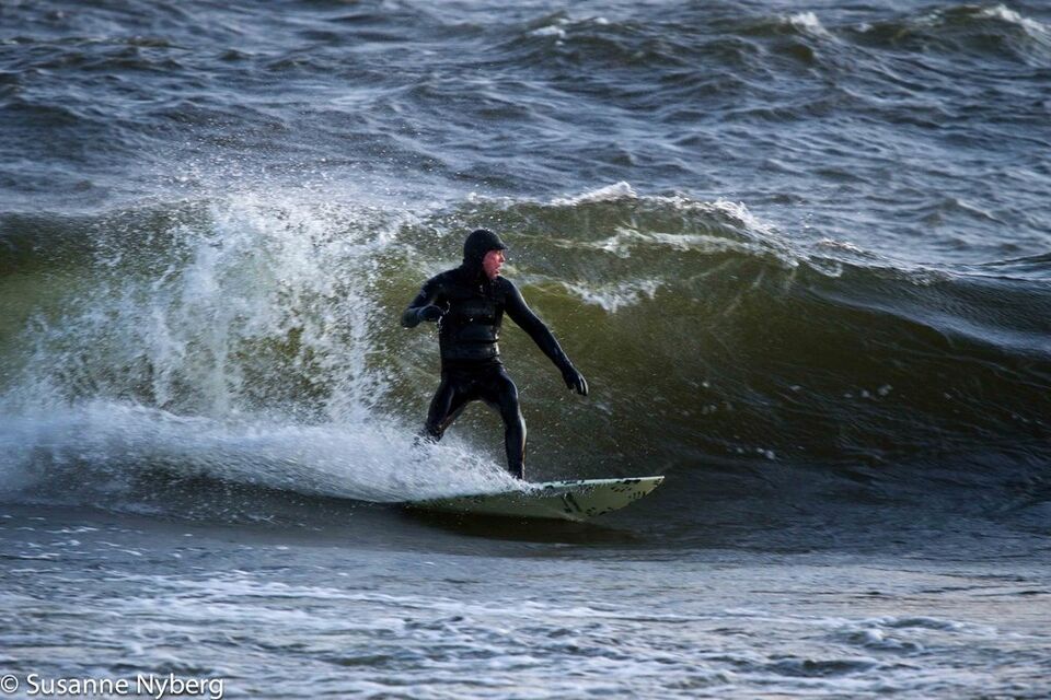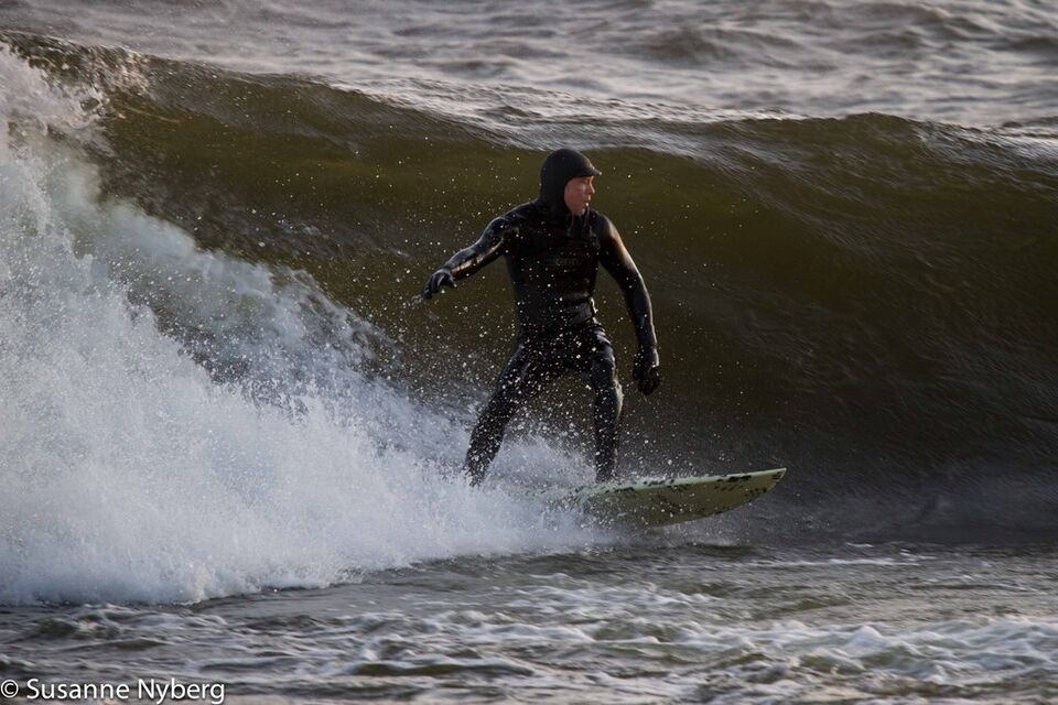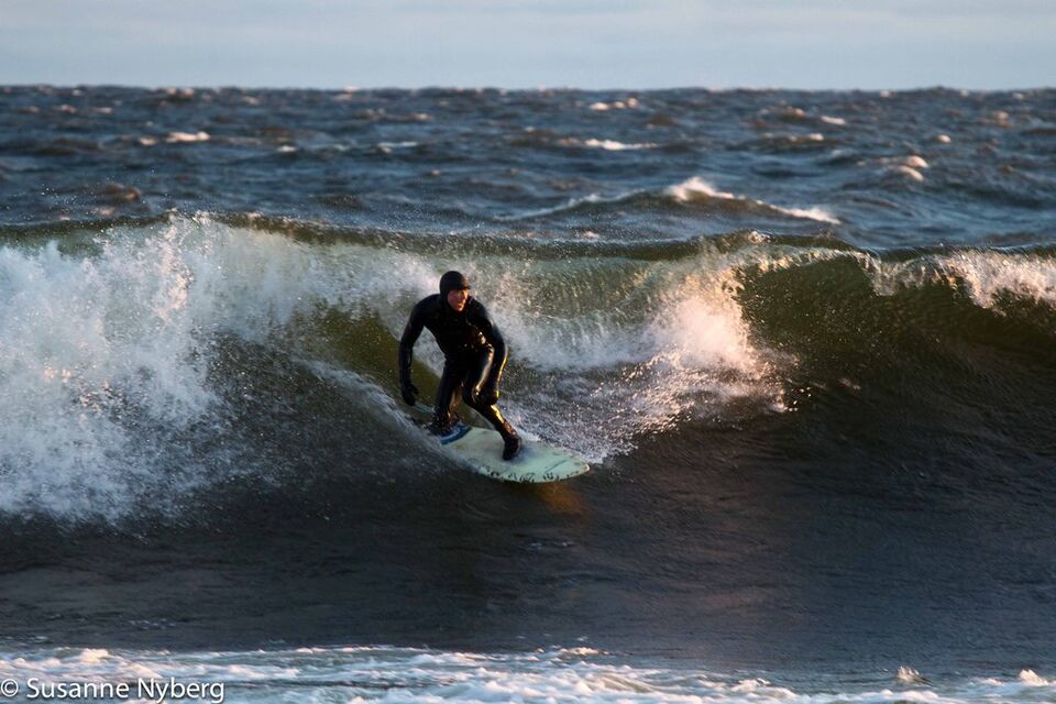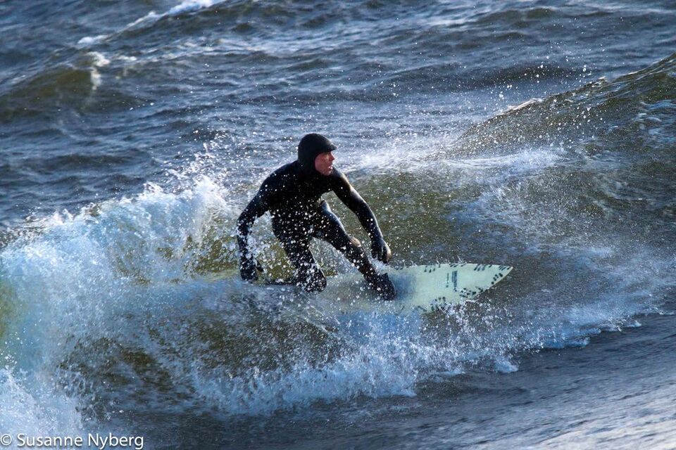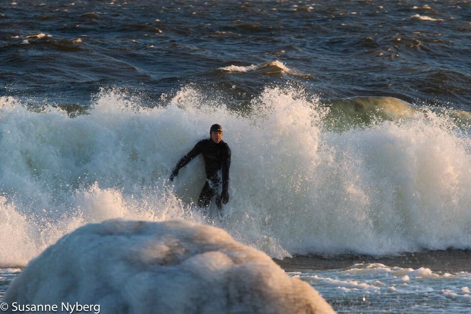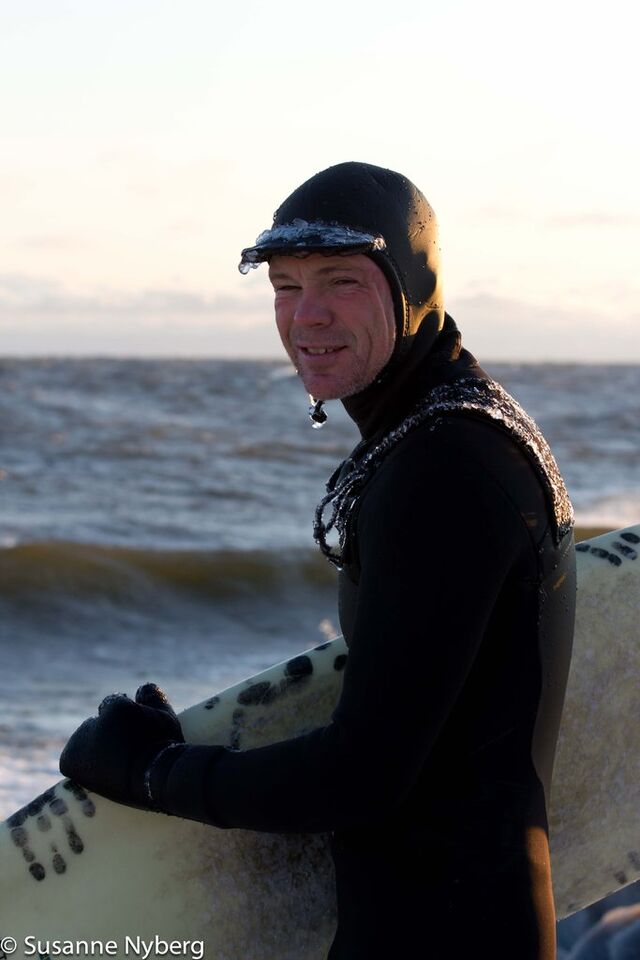 Det är mitten i av januari, 0-gradit vatten, vind 15m/s och minus 6 grader. Det stoppar inte en riktig surfare av norrländskt virke.