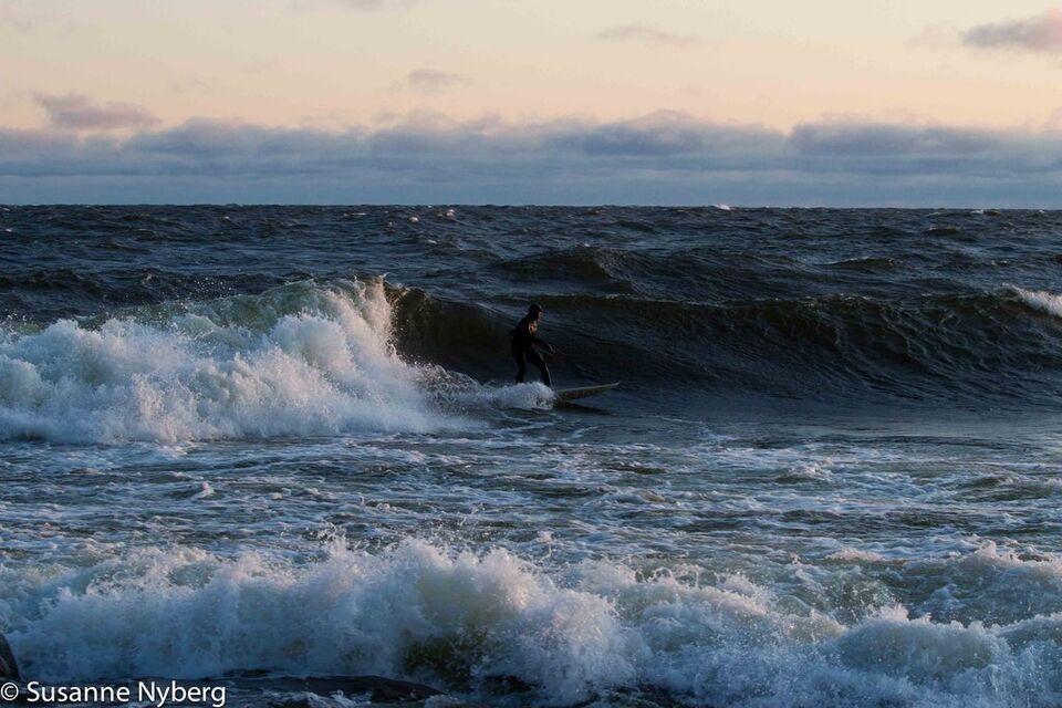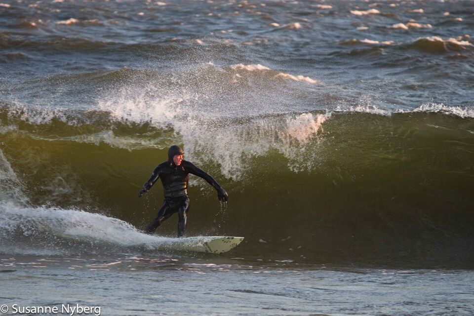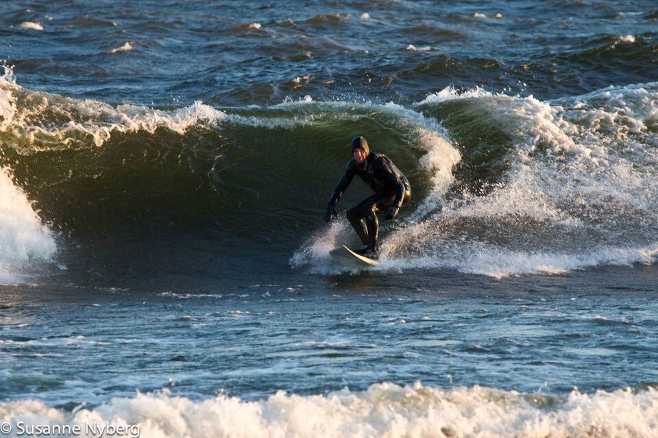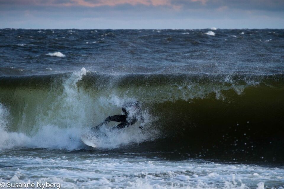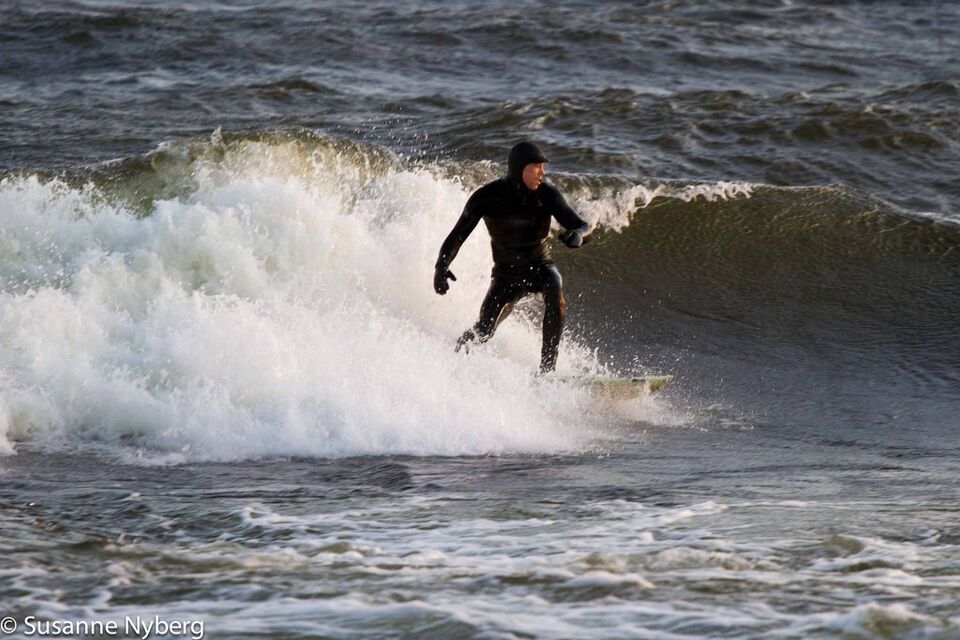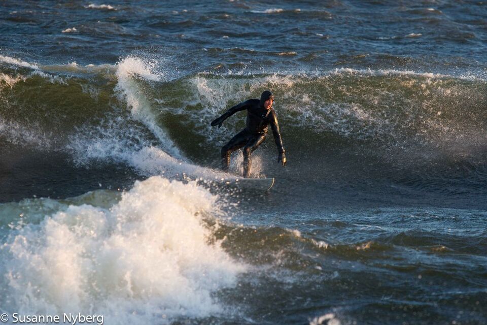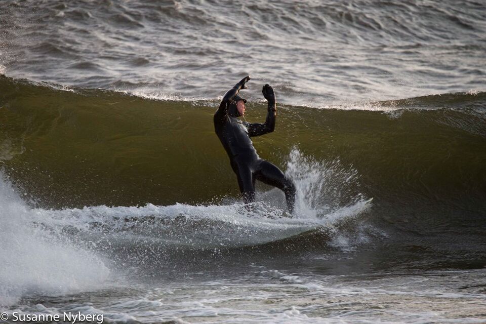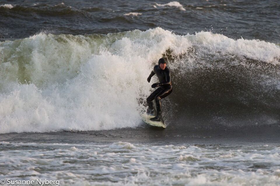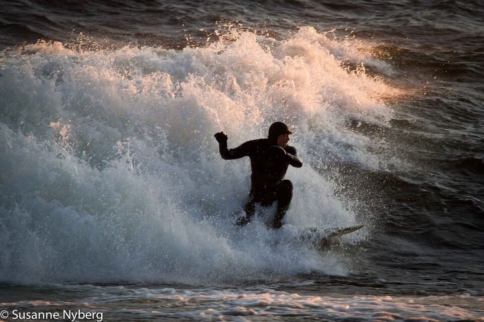 Det är mitten i av januari, 0-gradit vatten, vind 15m/s och minus 6 grader. Det stoppar inte en riktig surfare av norrländskt virke.