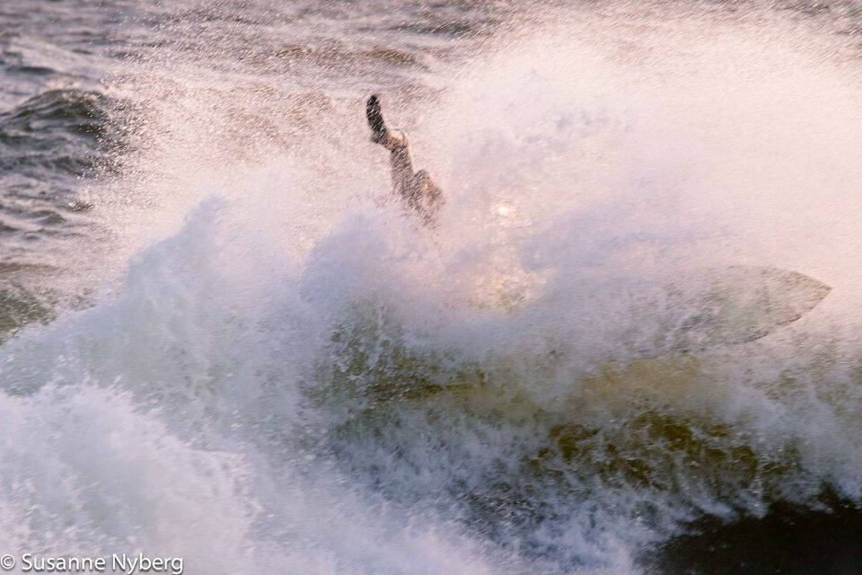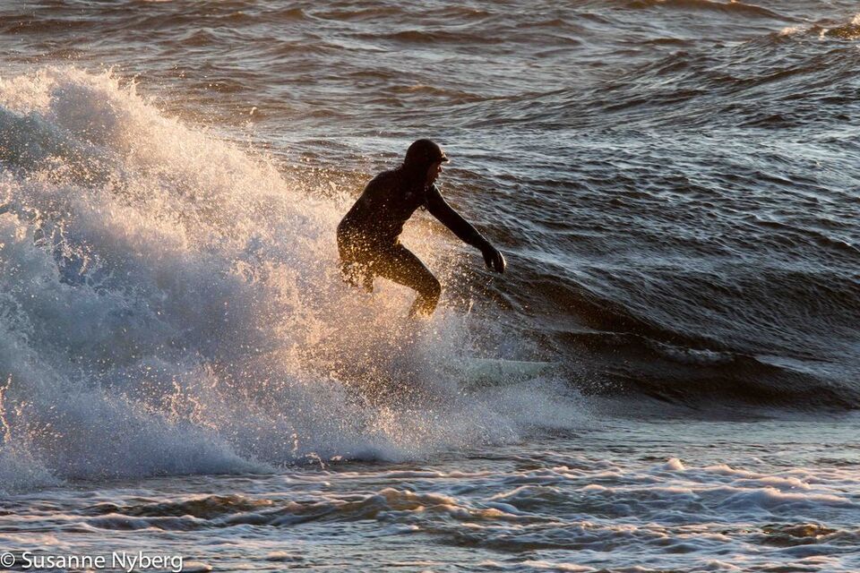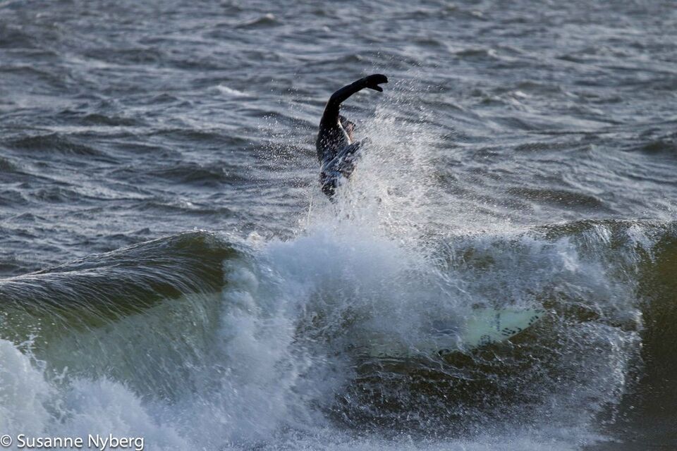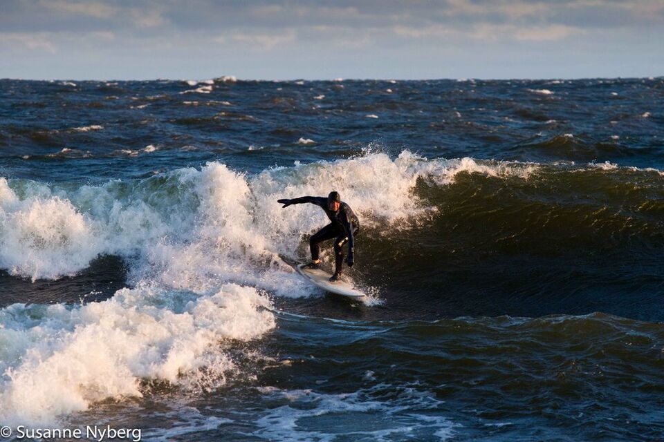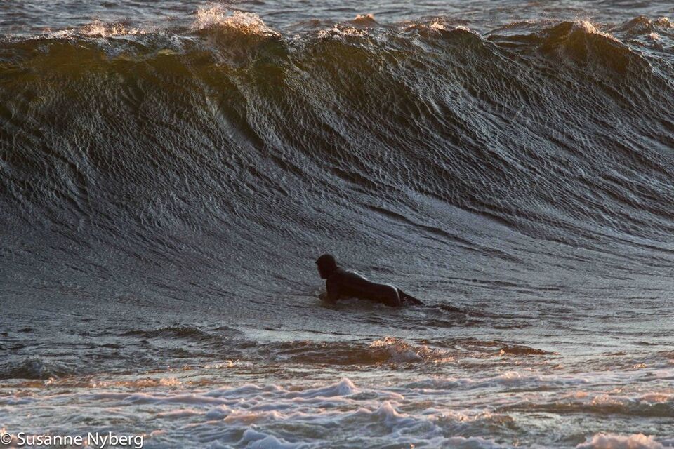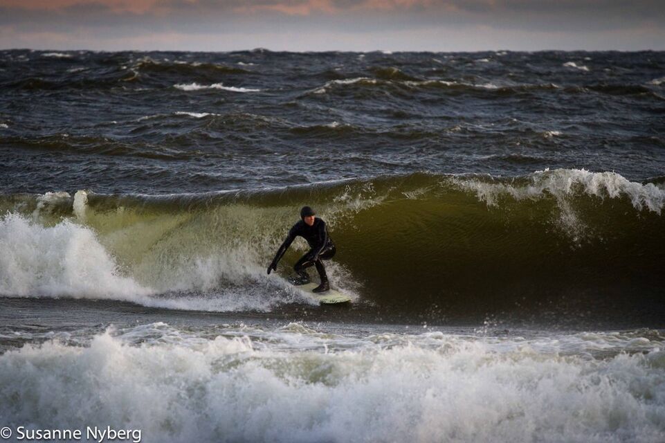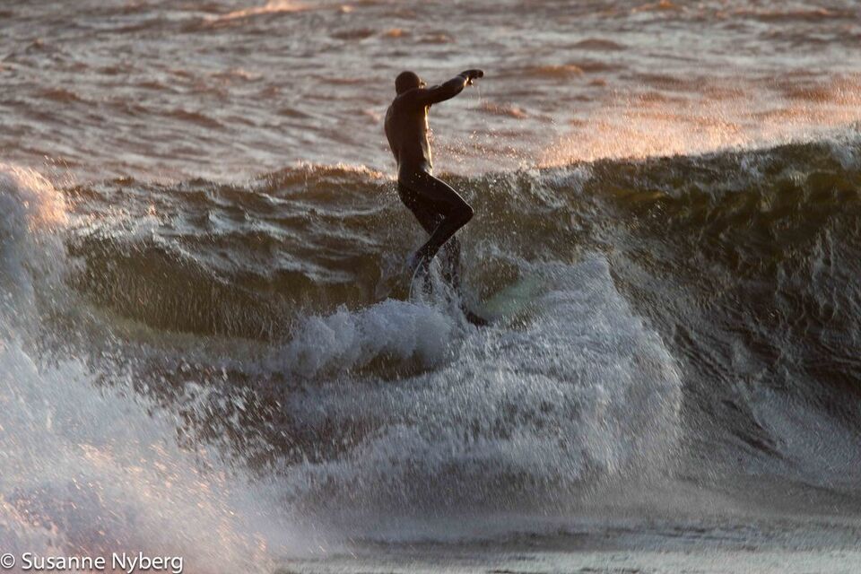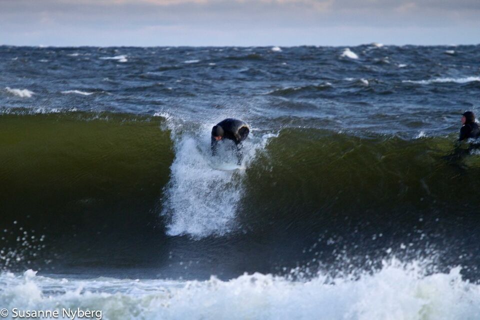 Det är mitten i av januari, 0-gradit vatten, vind 15m/s och minus 6 grader. Det stoppar inte en riktig surfare av norrländskt virke.